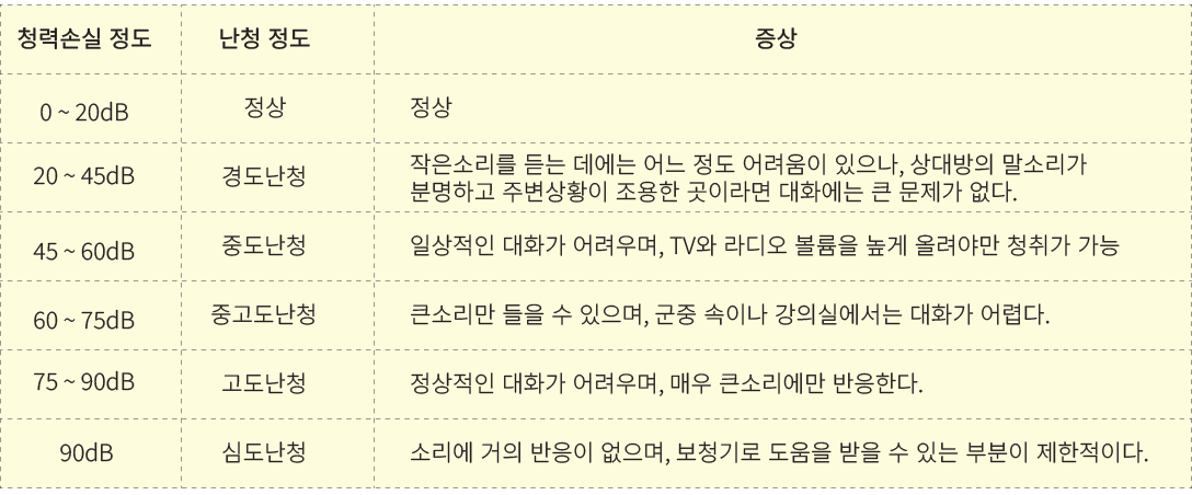 청력손실은 소리의 강도를 나타내는 데시벨(dB)로 표시되며, 데시벨(dB)의 수치에 따라 청력손실 및 난청 정도를 구분할 수 있습니다.